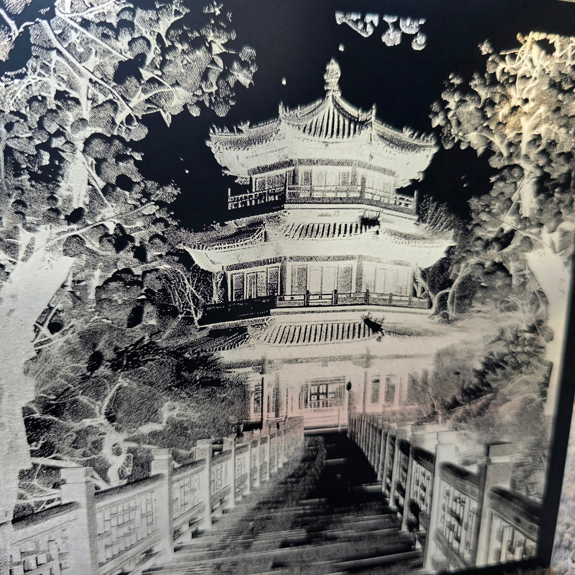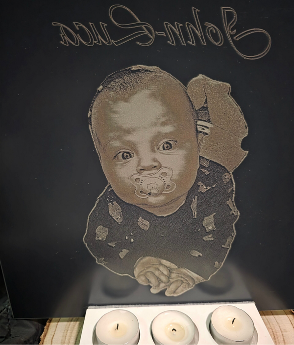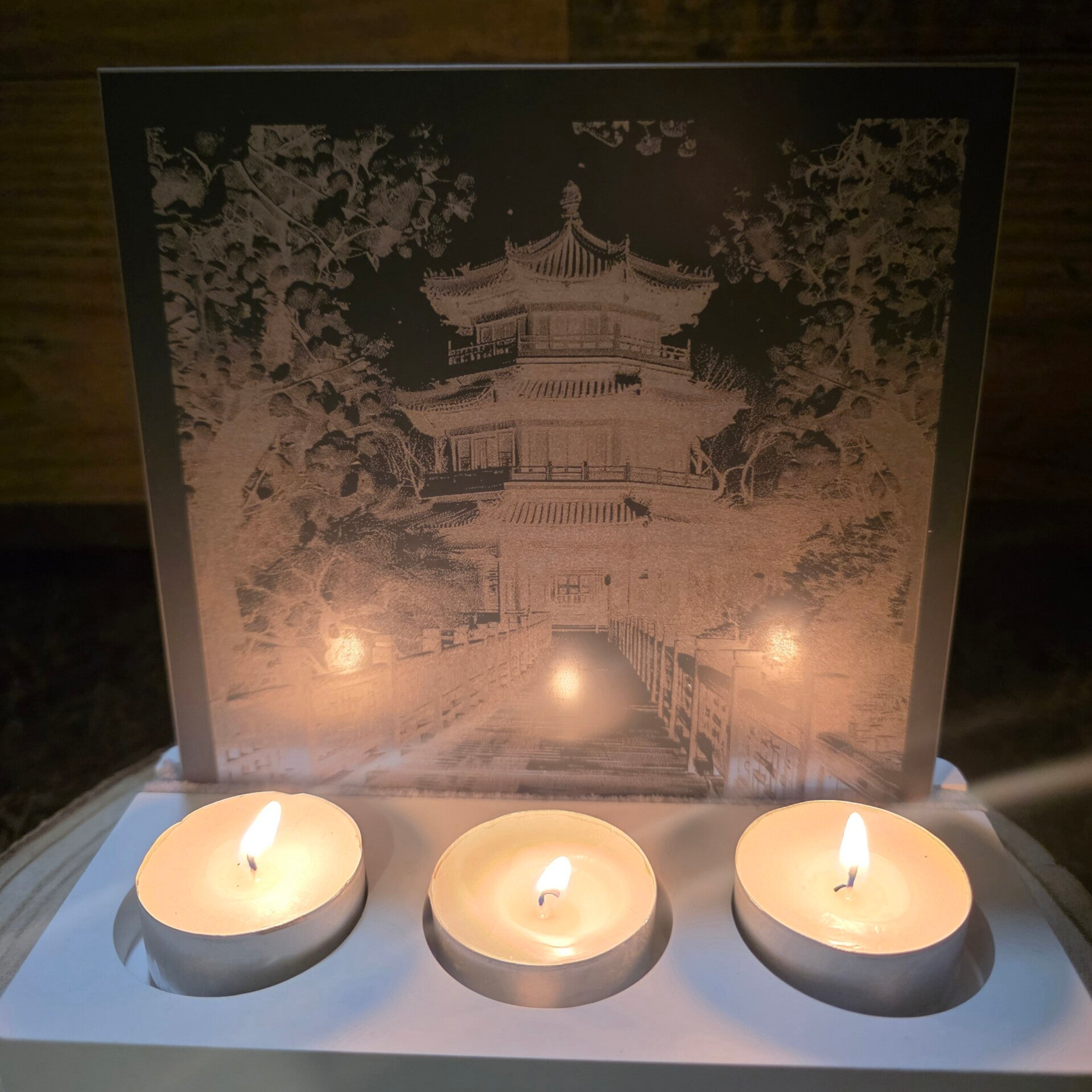 Diese Spiegelfliese (15×15 cm oder 33×33 cm) trägt dein Wunschmotiv, fein gelasert und klar sichtbar, sobald die Teelichter im Halter dahinter angezündet werden. Das Licht bricht sich in der Gravur und lässt das Motiv lebendig wirken – still, schön und tief.